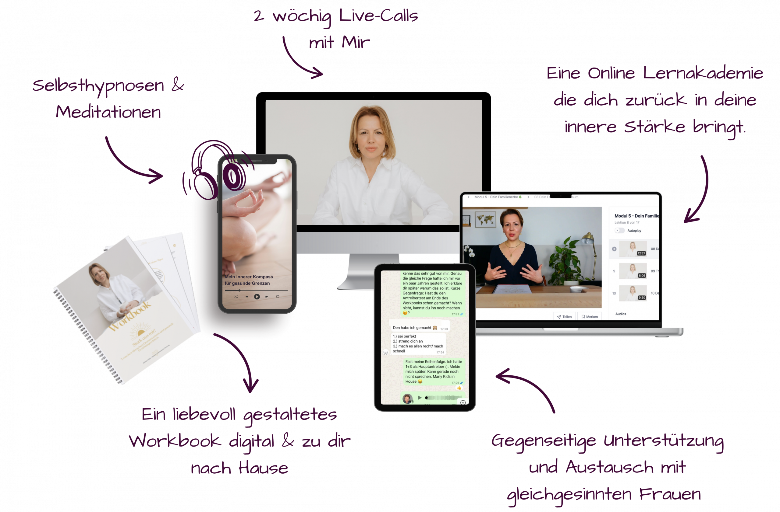 Über 100 Videolektionen in 8 Modulen im persönlichen Kursbereich, die dich zurück in deine innere Stärke bringen.