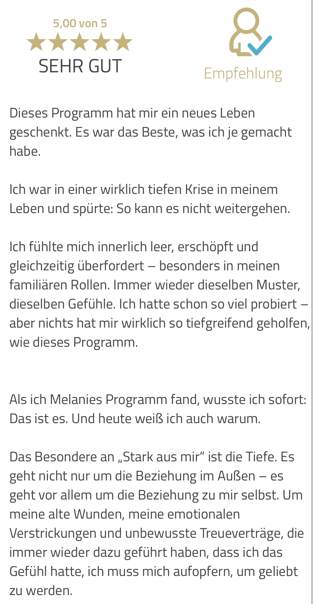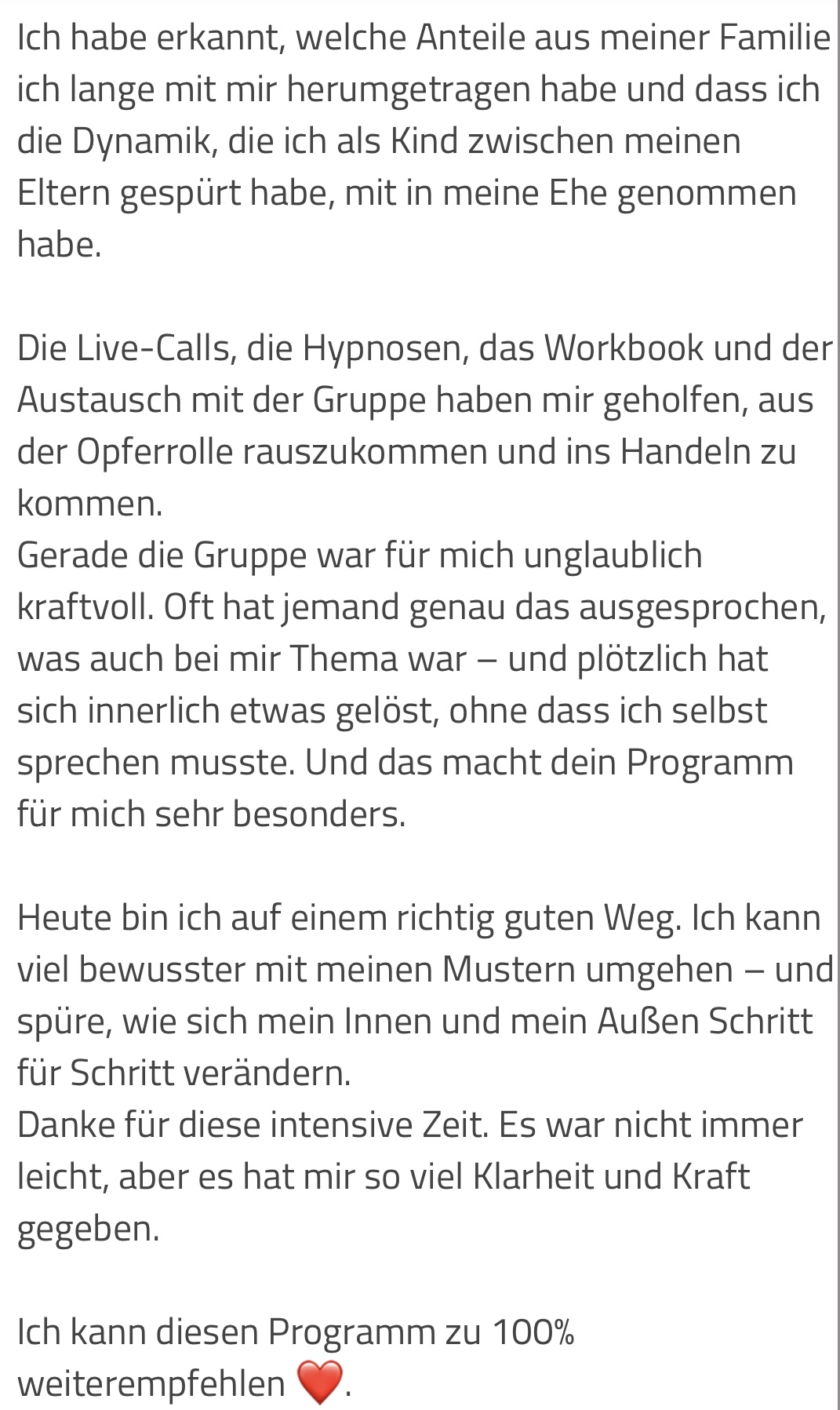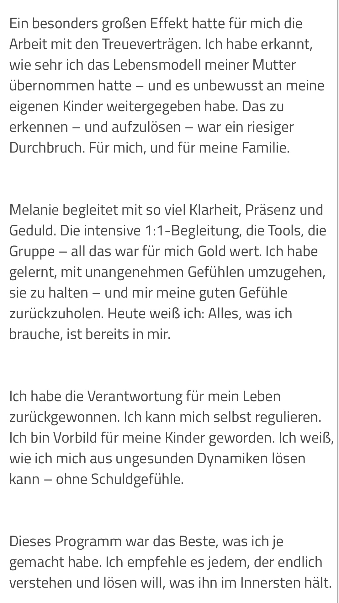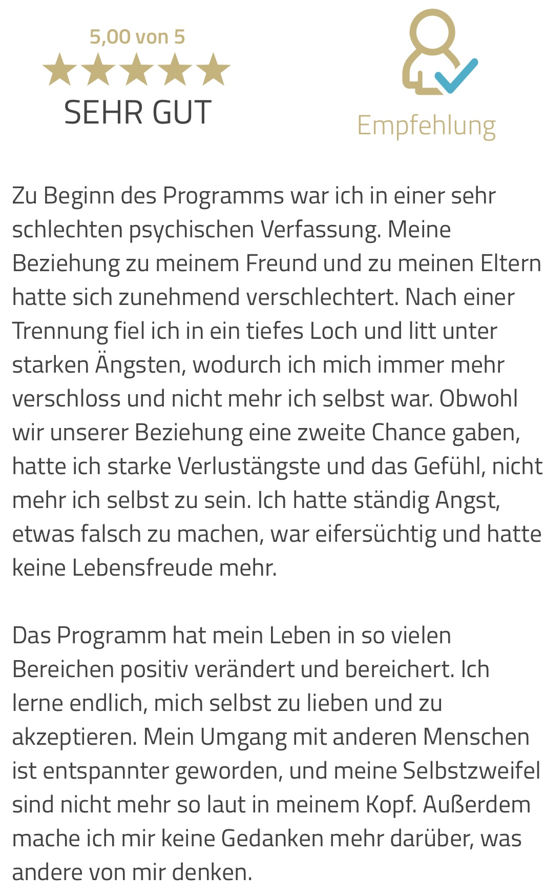 Das Programm kam für mich in einer tiefen Lebenskrise genau zur richtigen Zeit und hat mir nachhaltig geholfen, meine innere Leere, Erschöpfung und wiederkehrende Muster zu lösen.