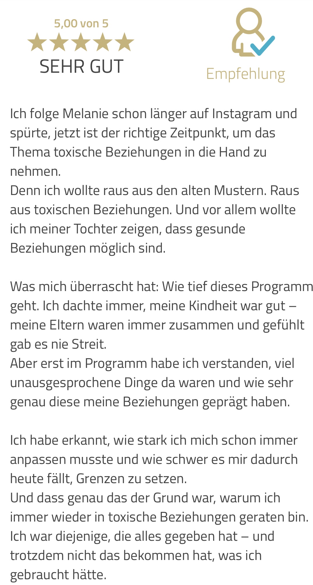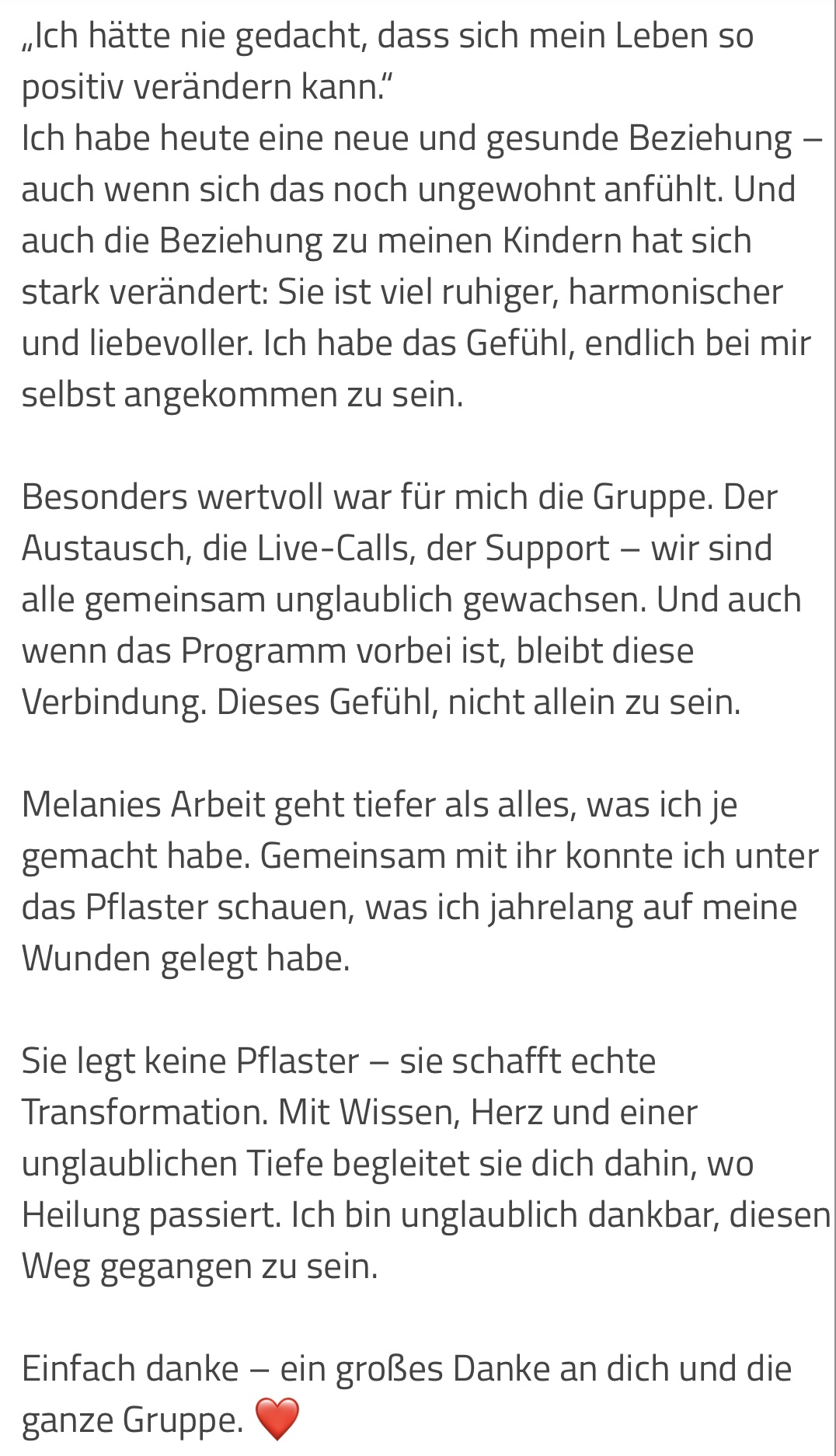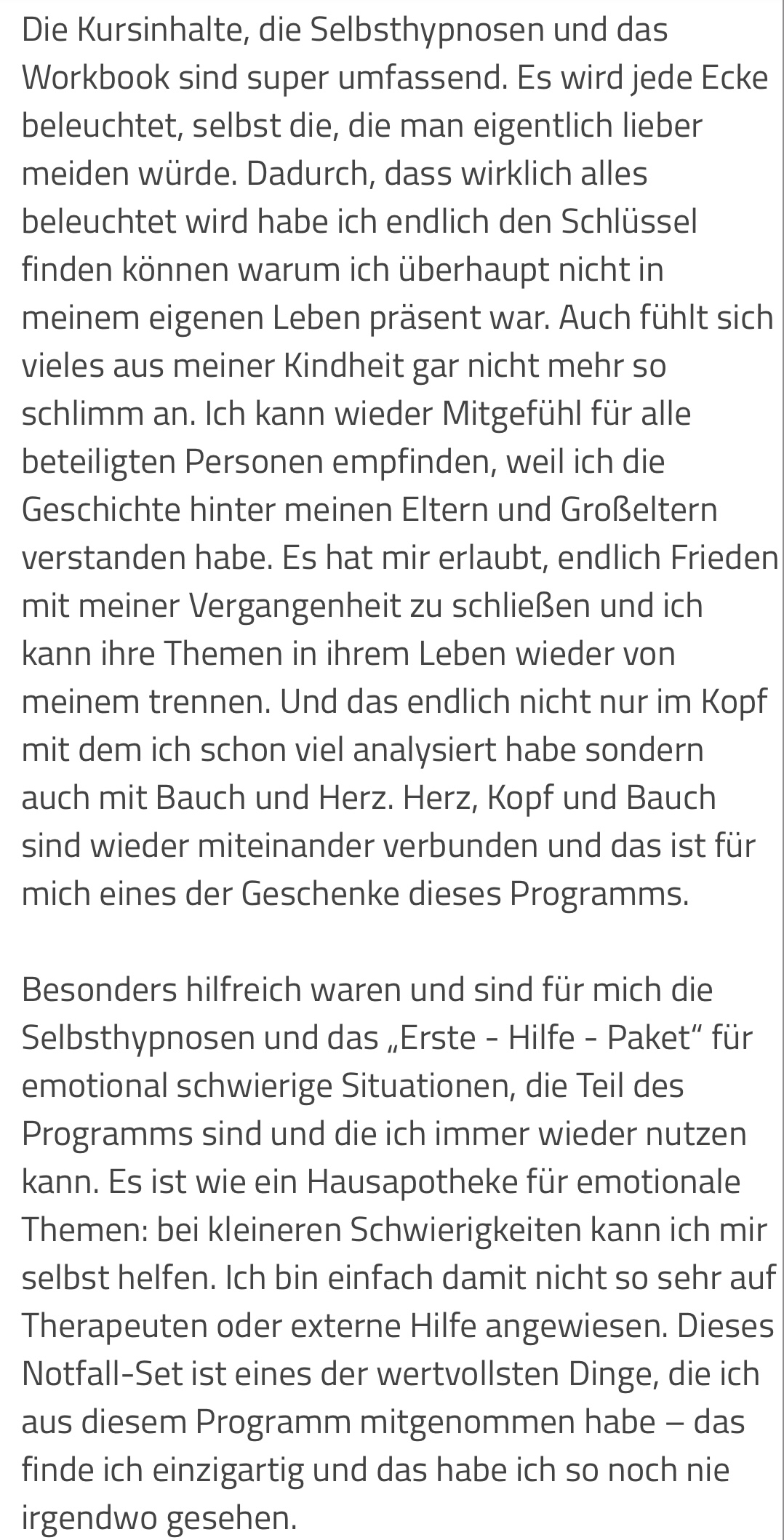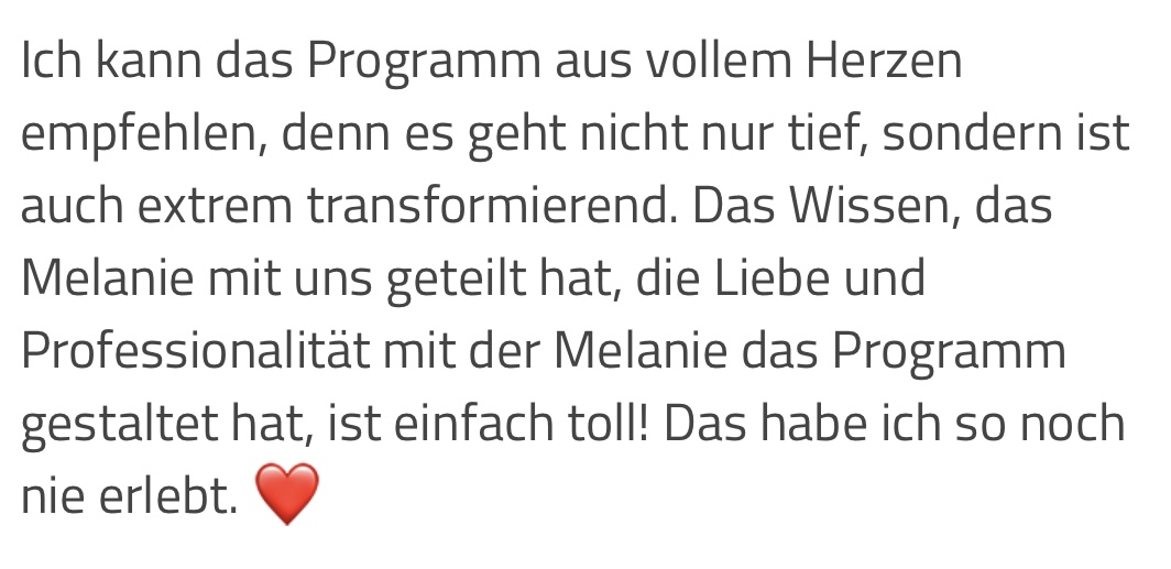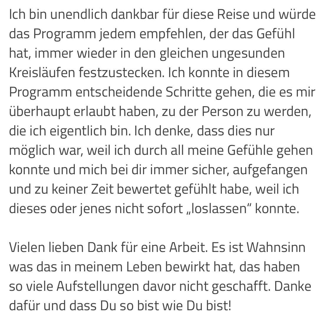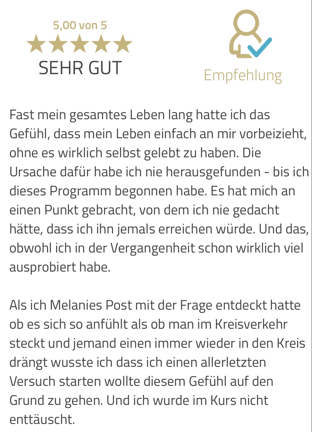 Das Programm kam für mich in einer tiefen Lebenskrise genau zur richtigen Zeit und hat mir nachhaltig geholfen, meine innere Leere, Erschöpfung und wiederkehrende Muster zu lösen.