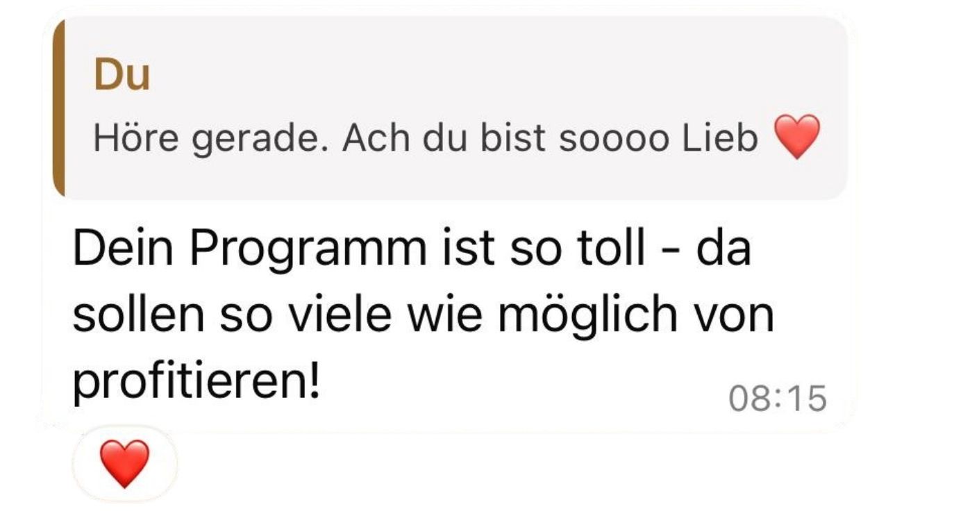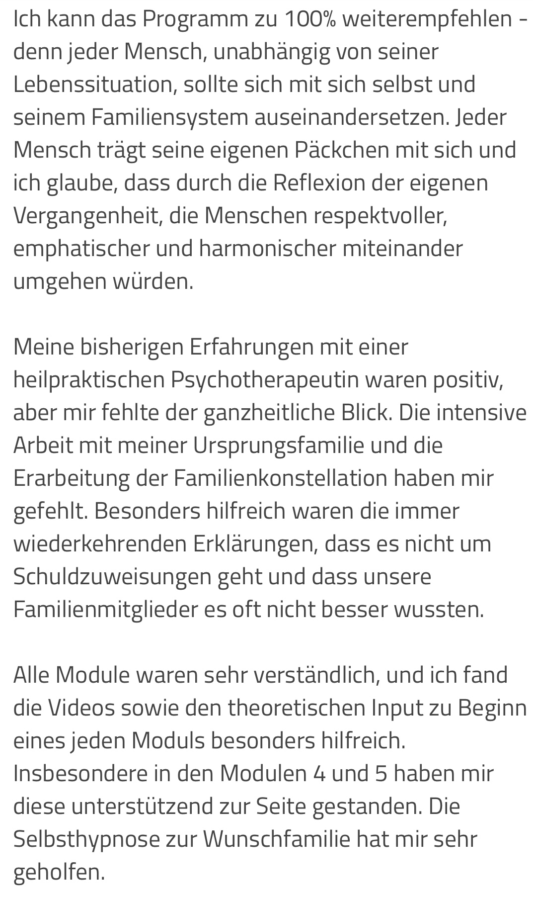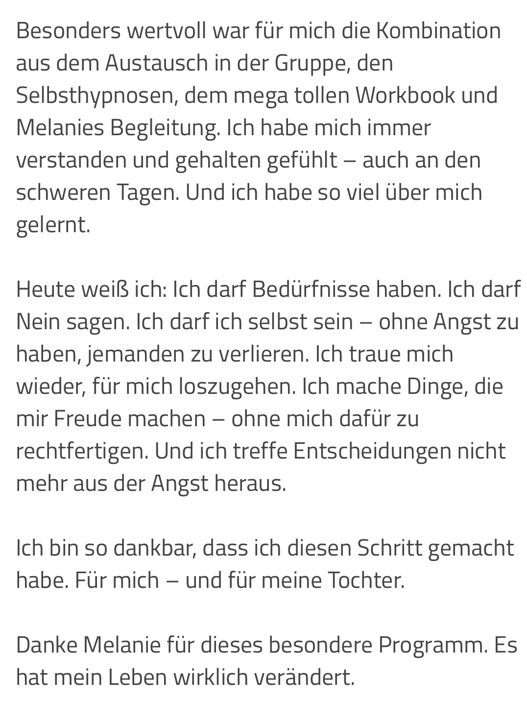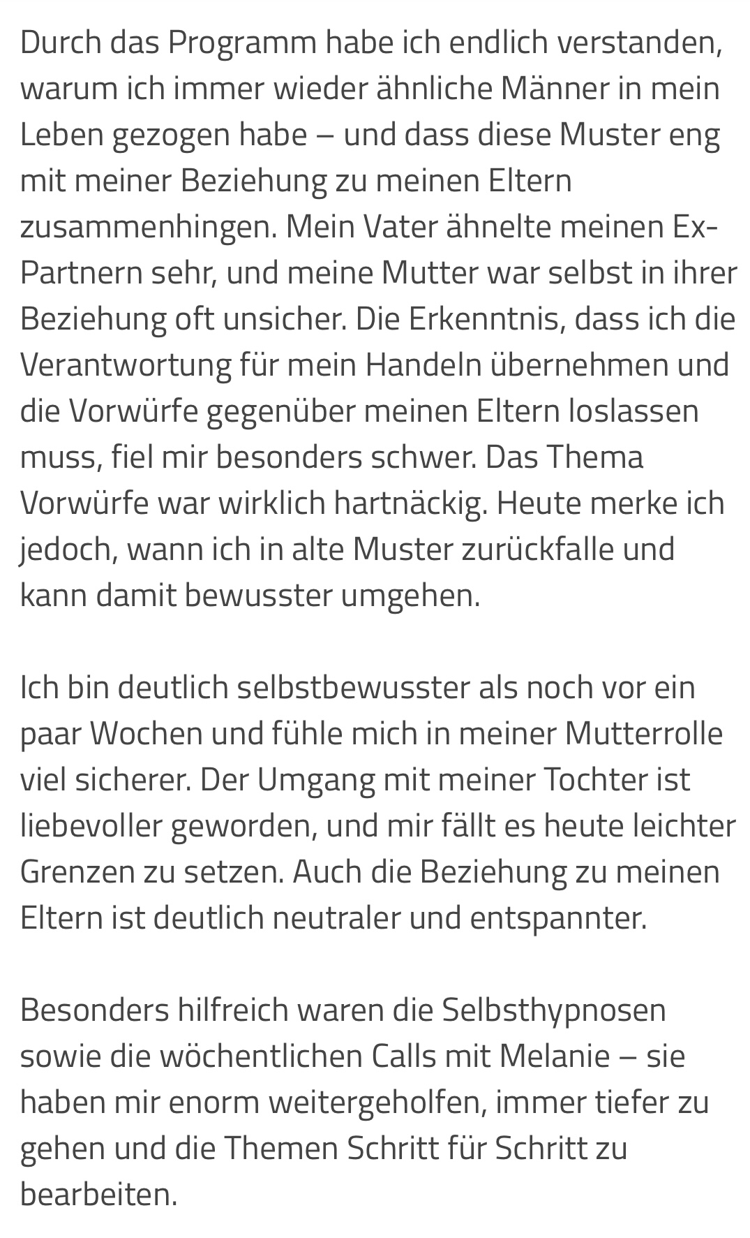 Das Programm kam für mich in einer tiefen Lebenskrise genau zur richtigen Zeit und hat mir nachhaltig geholfen, meine innere Leere, Erschöpfung und wiederkehrende Muster zu lösen.