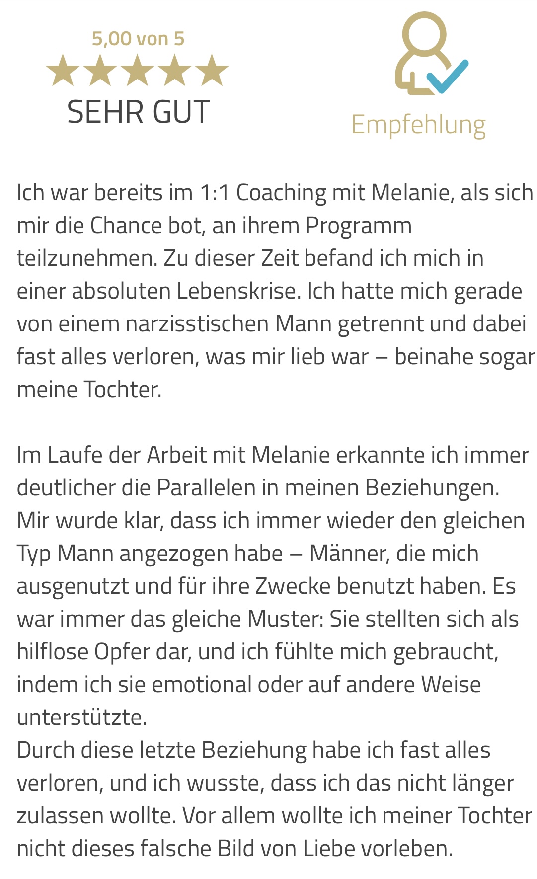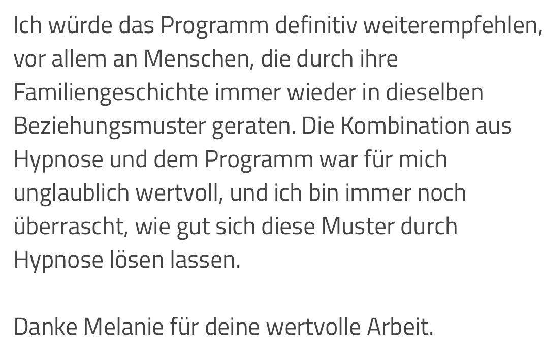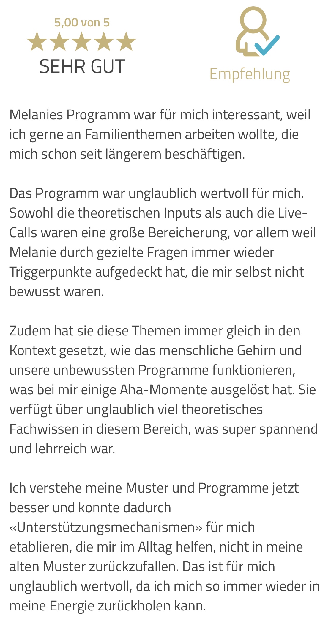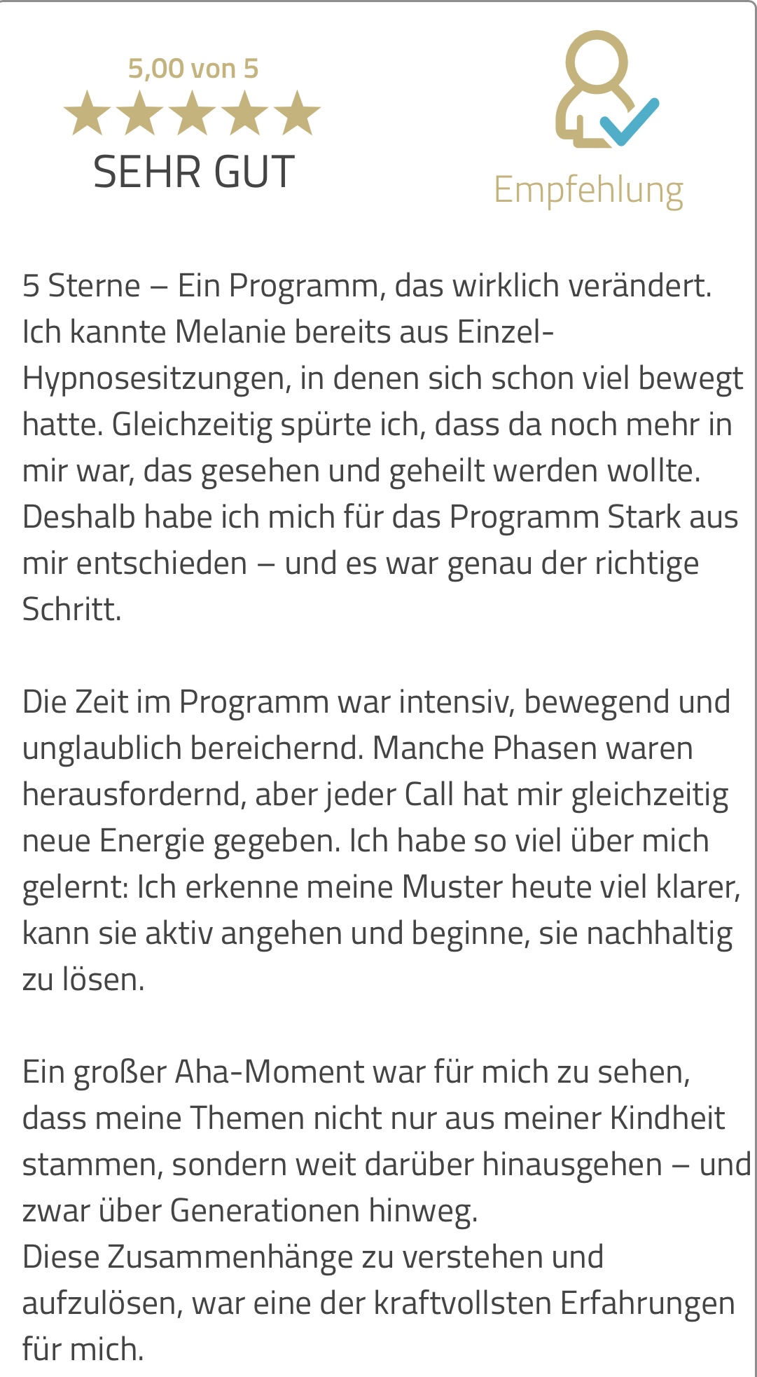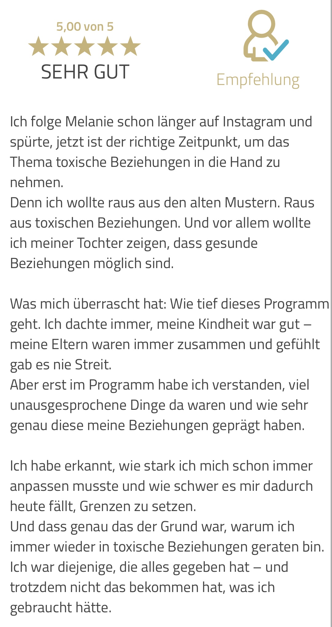 Das Programm kam für mich in einer tiefen Lebenskrise genau zur richtigen Zeit und hat mir nachhaltig geholfen, meine innere Leere, Erschöpfung und wiederkehrende Muster zu lösen.