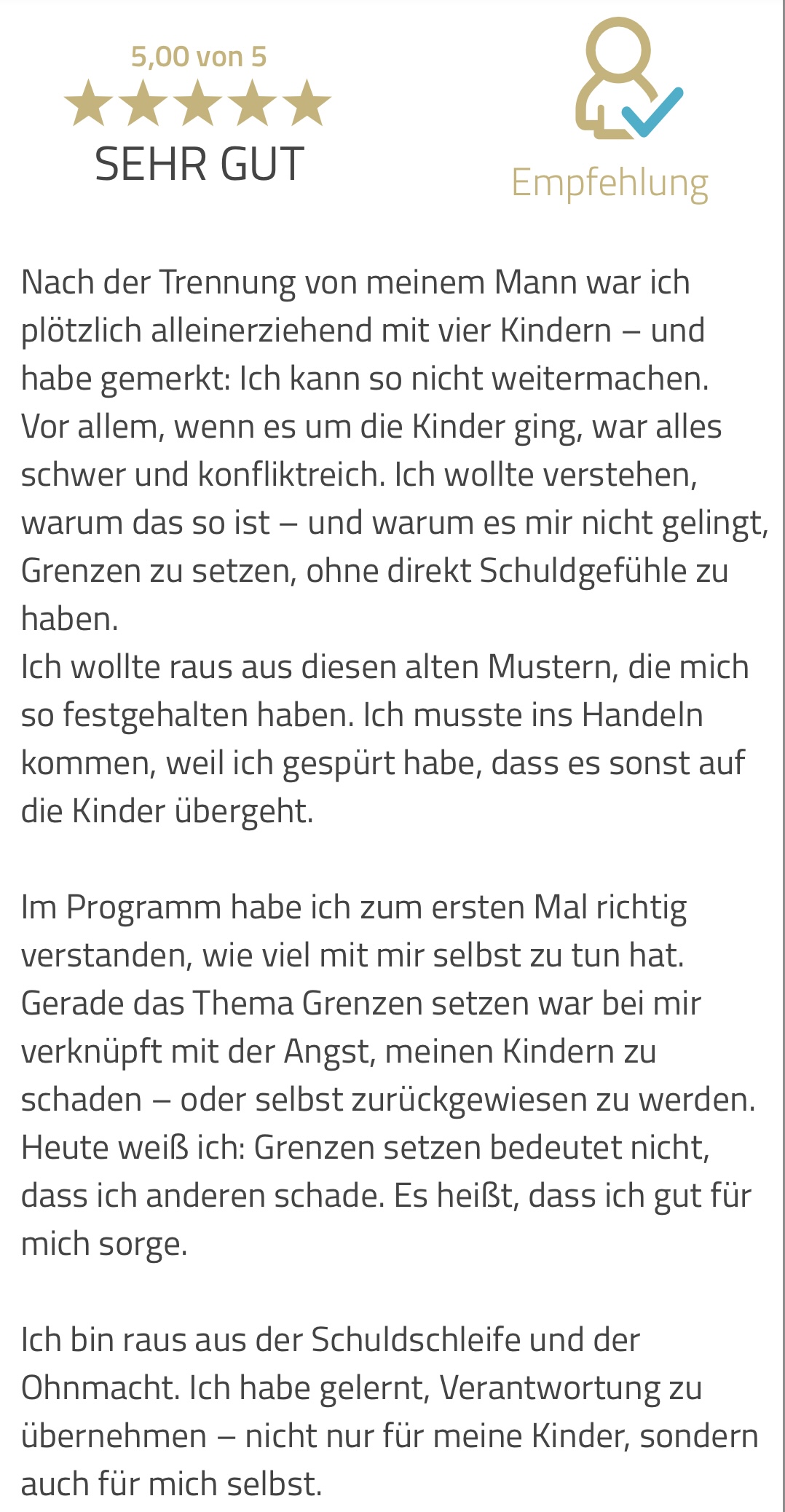 Durch die intensive Begleitung, Tools und die Gruppe lernte ich, Gefühle zu halten, mich selbst zu regulieren und Verantwortung für mein Leben zurückzugewinnen. Heute fühle ich mich frei von Schuldgefühlen, bin Vorbild für meine Kinder und empfehle das Programm von Herzen weiter.