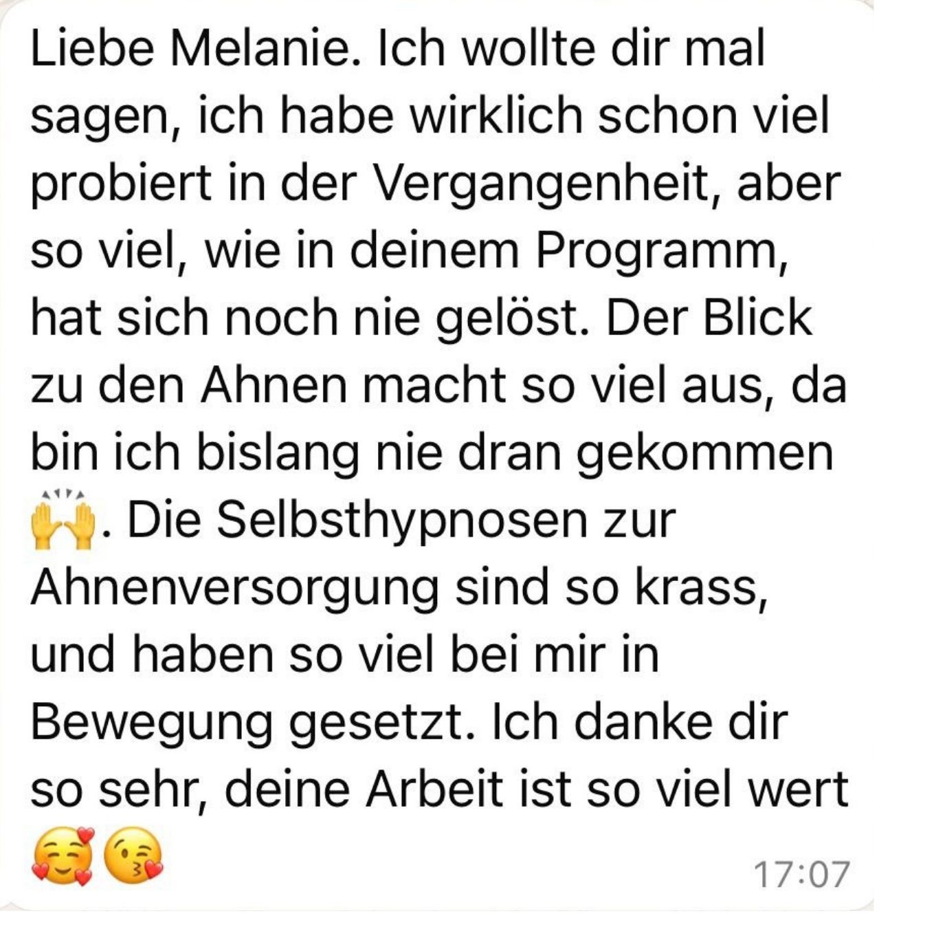 Du verstehst, wie deine Mutter- und Vaterwunden deine Beziehungen und dein emotionales Erleben bis heute beeinflussen.Du erkennst, mit welchen Grundmustern du als Kind versucht hast, dein Familiensystem zu spiegeln. Mit einer kraftvollen Selbsthypnose stärken wir dein Ur-Vertrauen, welches die Grundlage für Selbstliebe und Selbstschutz bildet.
